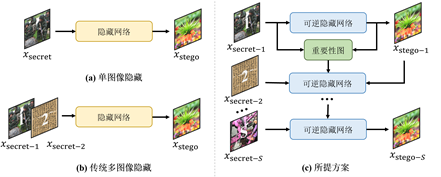 为了解决传统思路扩展面临病态缺陷的问题,景俊鹏提出了一种多步骤、多节点灵活处理的思路,将传统单步骤处理的病态问题转换为多步骤的适定问题,动态化、模块化组装网络。这些研究在一定程度上分别推进了对图像隐藏领域核心的质量和容量问题的研究。
