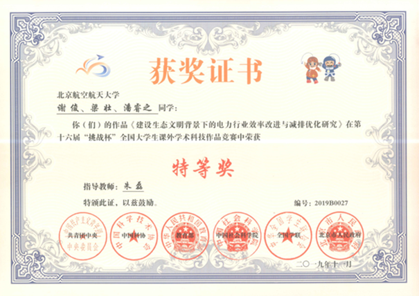 挑战杯全国特等奖证书