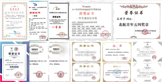 依托产教融合大趋势,孟祥宇代表团队,以第一学生作者及答辩人身份参加多项创新创业赛事,获得第七届中国国际“互联网+”大学生创新创业大赛全国总决赛金奖、第七届中国国际“互联网+”创新创业大赛(北京赛区)金奖、第十届高校科技创新成果展示推介会一等奖暨创新金奖、第二届中国空天动力创新创业大赛决赛第一名。