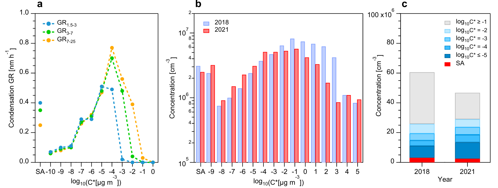 图2. 不同挥发性OOMs对新粒子增长速率GR的贡献及其浓度的年际对比。a. 低挥发性OOMs(log10(C*)≤-2)对GR占主导贡献。b—c. 2018年(数据取自Qiao et al., ES&T, 2021研究)和2021年秋季气态硫酸及不同挥发性OOMs浓度比较结果,相较于2018年秋季,2021年秋季OOMs总浓度显著降低,而低挥发性OOMs浓度反而升高