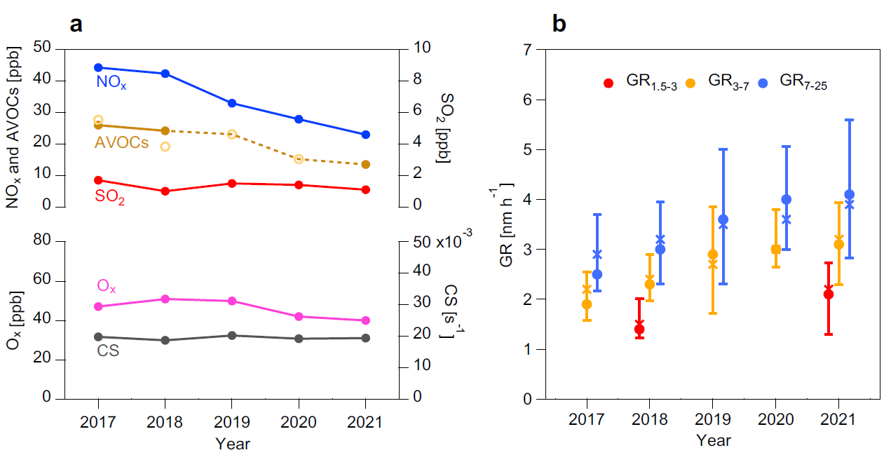 图1. 2017—2021年气态污染物浓度与新粒子增长速率年际变化特征。a. AVOCs和NOx浓度呈显著降低趋势,SO2浓度、反映区域大气氧化性水平的Ox浓度(Ox= O3+NO2)、凝结汇CS相对较为稳定。b. 新粒子增长速率GR呈显著升高趋势