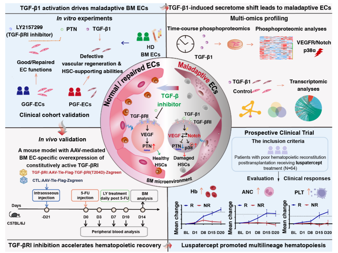 基于上述发现,团队进一步开展临床转化探索。研究发现,在移植后造血重建不良的患者中,骨髓血管内皮细胞TGF-β1通路蛋白表达显著上升。更令人振奋的是,在一项前瞻性临床研究中,Luspatercept在移植后造血重建方面表现出治疗优势,多系造血恢复时间缩短,并未出现严重不良反应,为造血重建不良患者提供了新的治疗希望。