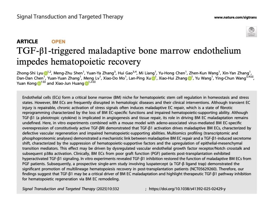 黄晓军指出,本研究通过临床前研究、多组学研究和前瞻性临床研究,揭示了靶向TGF-β通路是治疗由骨髓血管内皮细胞功能失调引发的移植后造血重建不良等疾病的有效策略,为解析疾病状态下造血重建不良的病因学和治疗方向提供了全新视角,具有重要的理论意义和临床转化前景。