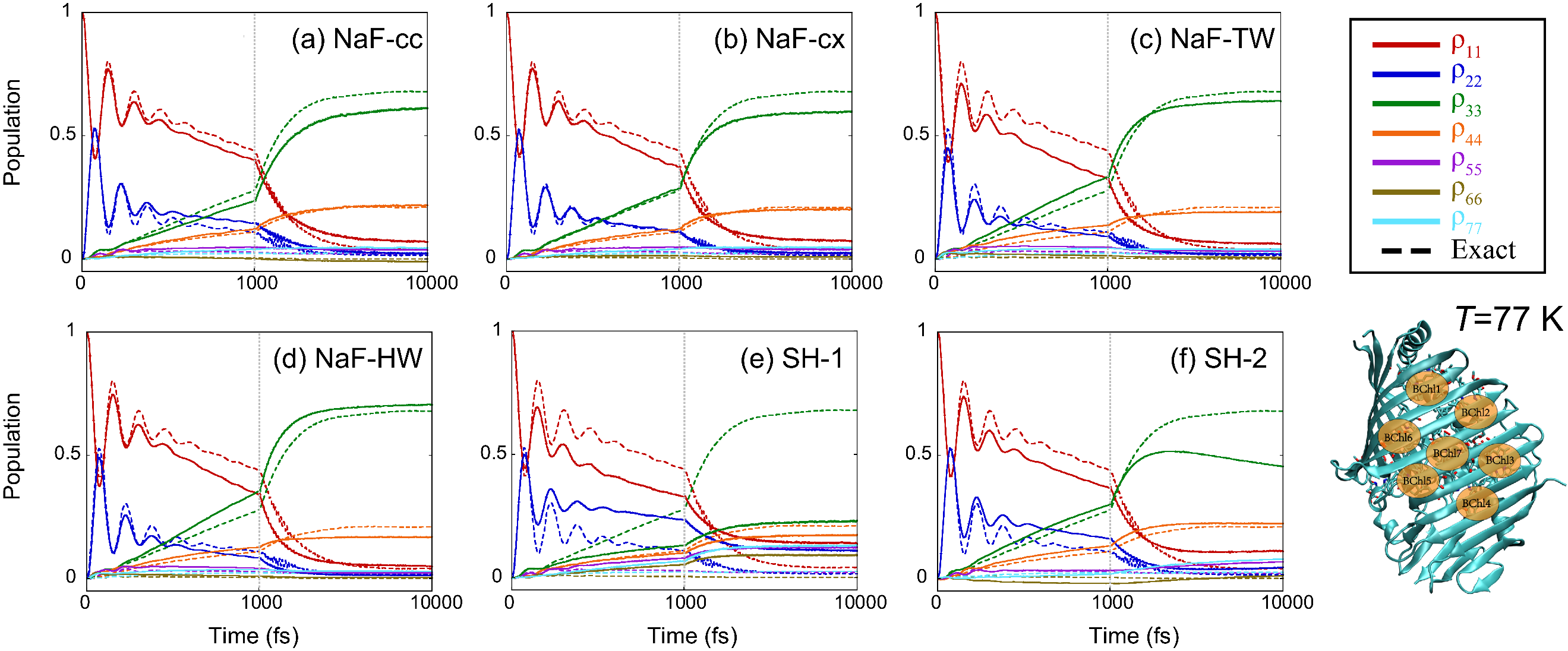 图2. FMO模型在77K下的布居数动力学结果,实线和虚线分别代表轨迹方法和数值严格结果