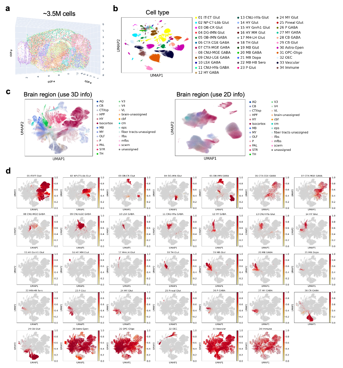 小鼠大脑3D空间图谱包含超过300万细胞和200张空间切片(图2a),远超现有空间组学计算方法的处理能力。相比之下,DECIPHER仅需数小时即可完成建模。DECIPHER的结果不仅能够准确重建细胞类型,还能精确再现大脑中的空间区域(图2b),同时清晰反映不同细胞类型在各大脑区域的空间特异性分布(图2c)。