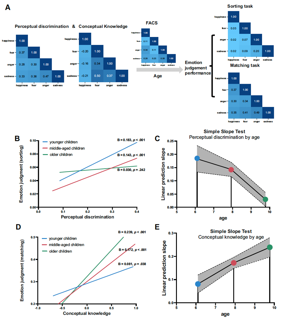图4. A.表征相似性分析流程;B—E. 知觉区分与概念知识在儿童情绪理解中的贡献变化