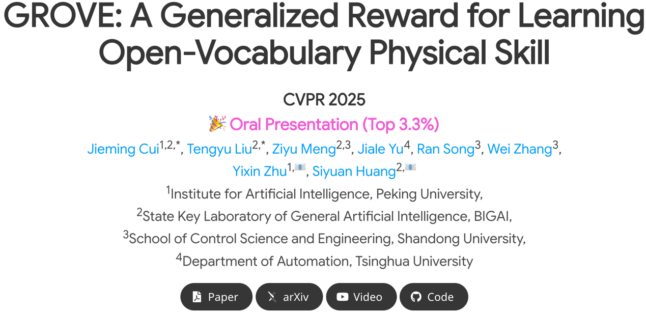 麻豆精品秘 国产传媒人工智能研究院朱毅鑫课题组及合作者的成果以“GROVE: A Generalized Reward for Learning Open-Vocabulary Physical Skill”为题,被人工智能顶级会议CVPR 2025接收为Oral Presentation(Top 3.3%)。