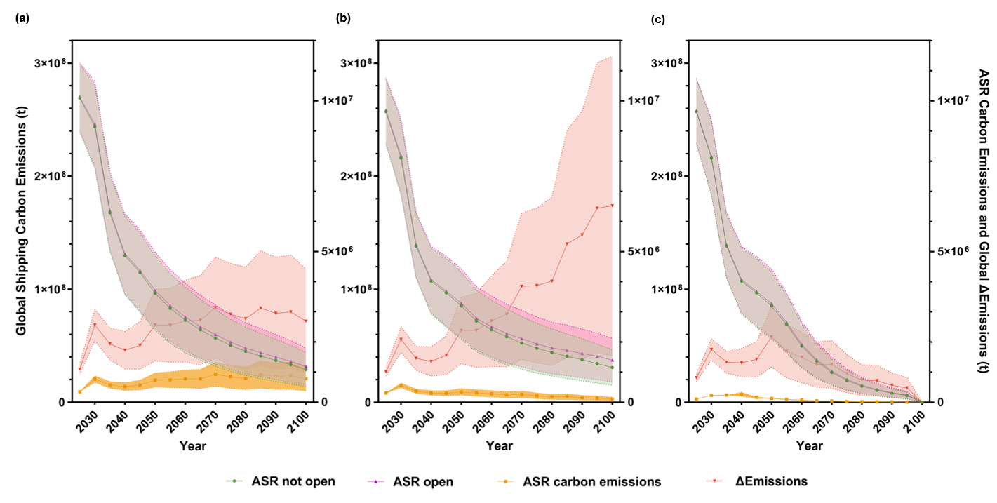 北极航道还将重塑全球航运碳排放时空分布。北极航道尽管缩短了航程、降低了单次排放,但总体交通量的激增将使北极区域碳排放到2100年跃升至全球总量的2%以上,成为全球前五大高排放通道(图4)。全球其他航运通道的碳排放的空间分布也将会随着北极航道的开通而发生变化:东北亚、北欧和北美等地区将面临更大的航运碳排放增长压力,而苏伊士运河、马六甲海峡等传统航运要道则略有缓解。整体来看,北极航道的开放不仅改变了全球航运网络,也显著加剧了碳排放的区域不均衡,对全球减排目标和环境公平提出了新的挑战。