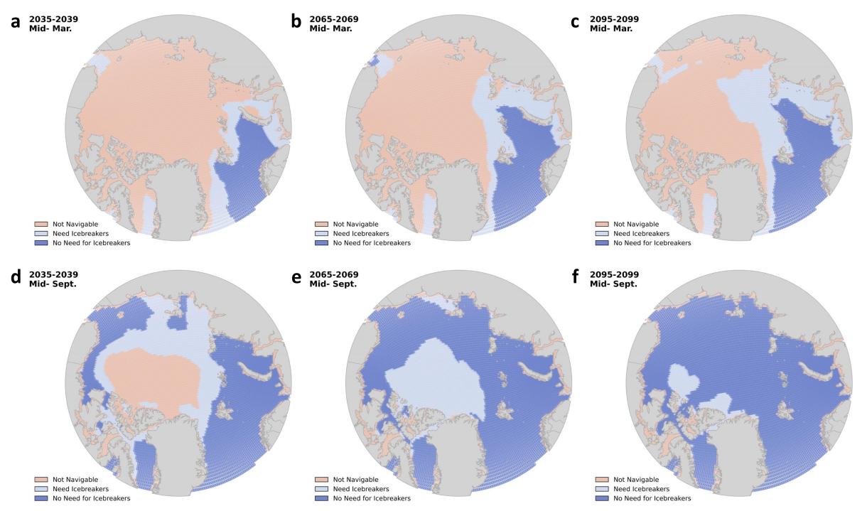 研究结果表明,在中等排放情景(SSP2—4.5)下,北极航道的通航潜力将在本世纪持续增强(图2)。2030年,年均可通航天数约为197天,到2050年增加至208天,2070年为217天,至2100年则进一步延长至247天。而在高排放情景(SSP5—8.5)下可通航天数将突破320天。北极通航条件的改善不仅体现在天数上,更体现在航道空间分布的变化。基于海冰厚度、海冰浓度和冰运动的动力学模拟结果显示,在未来不同年代的春季与夏季,北极航道的可航性显著提升。尤其在9月,大片海域将从“需破冰船”转变为“不需破冰船即可通航”,显示出夏季航运环境的快速改善。这一趋势凸显了气候变化对北极海冰消退的深远影响。