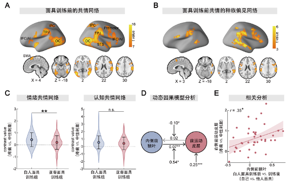 课题组在该研究中设计了一个面具训练任务,通过产生识脸错觉,在短时间内改变观察者的自身种族身份认同,诱发受试者的种族身份认同向所佩戴面具面孔的种族转移。在面具训练任务前后,测量自我报告、行为反应、事件相关电位(EEG)、功能核磁共振(fMRI)数据,并结合混合线性模型、多变量模式分析、动态因果模型等方法,分析基于自身面孔的种族身份认同是否可以从本族转移至他族,以及种族身份认同转移是否会削弱共情和利他行为中的种族内群体偏好。