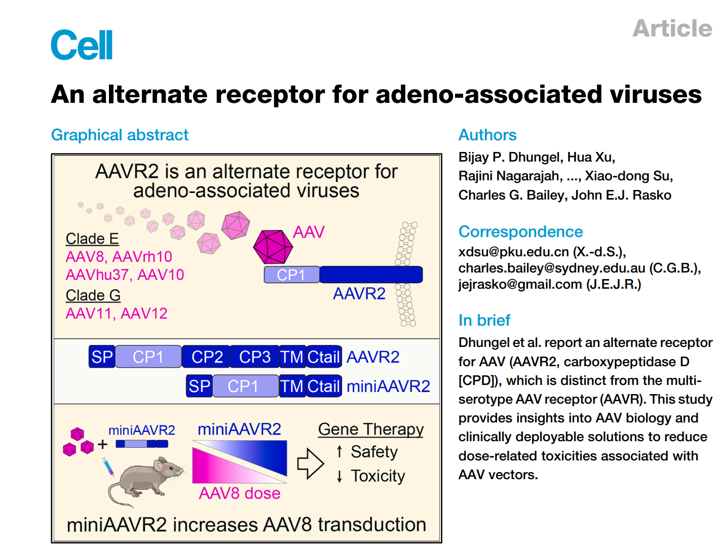 图1. 2025年7月14日上线的《细胞》文章《AAV病毒的新型受体》(“An alternate receptor for adeno-associated viruses” )揭示了羧肽酶D(Carboxypeptidase D, CPD)可以作为Clade E和G家族AAV的高亲和性新型受体,且将其命名为AAVR2