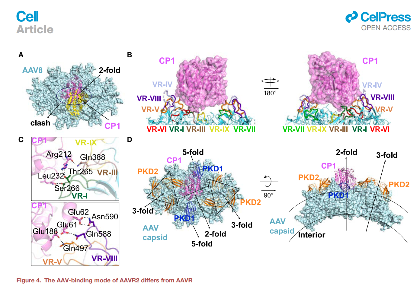 图2. AAVR2(CPD)的第一个结构域CP1结合于AAV8衣壳的二次对称轴区域,与以前发现的AAVR与AAV的结合方式完全不同。 除了展示AAVR2与AAV8相互作用的细节外(2C),此图还比较了AAVR与AAVR2结合AAV的不同之处(2D)