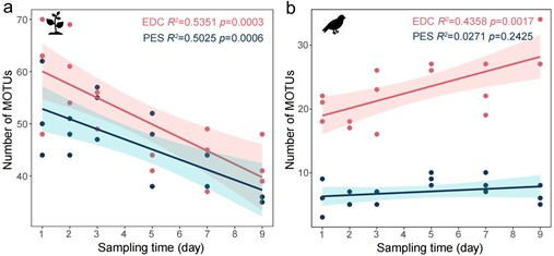 为进一步探究采样时长对eDNA吸附效果的影响,研究使用比较实验中效果最好的两种材料(EDC和PES),分别以1、2、3、5、7、9天的时长进行采样。结果显示空气eDNA的组成更迭很快,采样时长与检测到的植物多样性负相关,与脊椎动物多样性正相关(图3);说明样品更多反映的是当下空气中eDNA的组成,而非多日累积的结果,增加采样频率比延长单次采样时间更可能检测到更多物种。结合采样期间同步进行的植物物候调查,eDNA检出优势类群的变化同收样当天周边植物的物候(传粉)情况相关,可反映其物候状态。