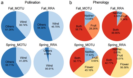 图4 不同传粉方式(a)与所处物候期(b)的植物在不同季节空气eDNA样品中检出的MOTU占比及序列丰度占比