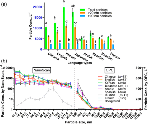 图2 日常交流中不同语言使用时排放的颗粒物浓度与粒径分布