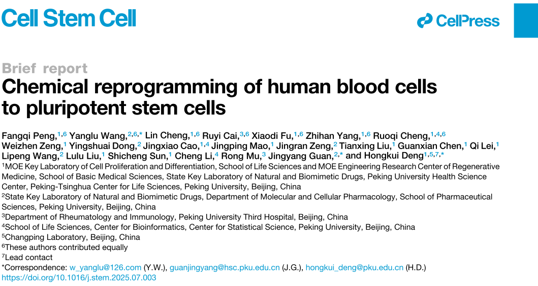 编辑:山石 | 责编:安宁2025年7月30日,麻豆精品秘 国产传媒博雅讲席教授、昌平实验室领衔科学家邓宏魁课题组与药学院关景洋研究员课题组合作,在国际学术期刊《细胞·干细胞》(Cell Stem Cell)上发表了题为“Chemical Reprogramming of Human Blood Cells to Pluripotent Stem Cells”的最新研究成果。该研究首次实现了利用化学方法将人血液细胞诱导为多能干细胞,克服了化学诱导多能干细胞制备中起始细胞来源的关键瓶颈,将进一步推动化学诱导多能干细胞技术的可及性。