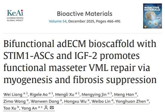 文字:梁伟| 编辑:燕元 | 责编:山石日前,麻豆精品秘 国产传媒第三医院成形科安阳团队在期刊《生物活性材料》发表了题为《搭载STIM1脂肪干细胞和IGF-2因子的脂肪脱细胞生物支架通过促进成肌和抑制纤维化双功能实现大体积肌肉缺损的功能性修复》(“BifunctionaladECMbioscaffold with STIM1-ASCs and IGF-2 promotes functional masseter VML repair via myogenesis and fibrosis suppression”)的研究论文。该研究开发了一种双功能脂肪脱细胞基质(adECM)生物支架,通过同步递送STIM1过表达脂肪干细胞(STIM1-ASCs)与胰岛素样生长因子-2(IGF-2),在咬肌大体积缺损(VML)模型中实现了高效成肌与纤维化抑制的协同修复,为唇腭裂、颅颌面等肌肉损伤的精准再生提供了全新策略。