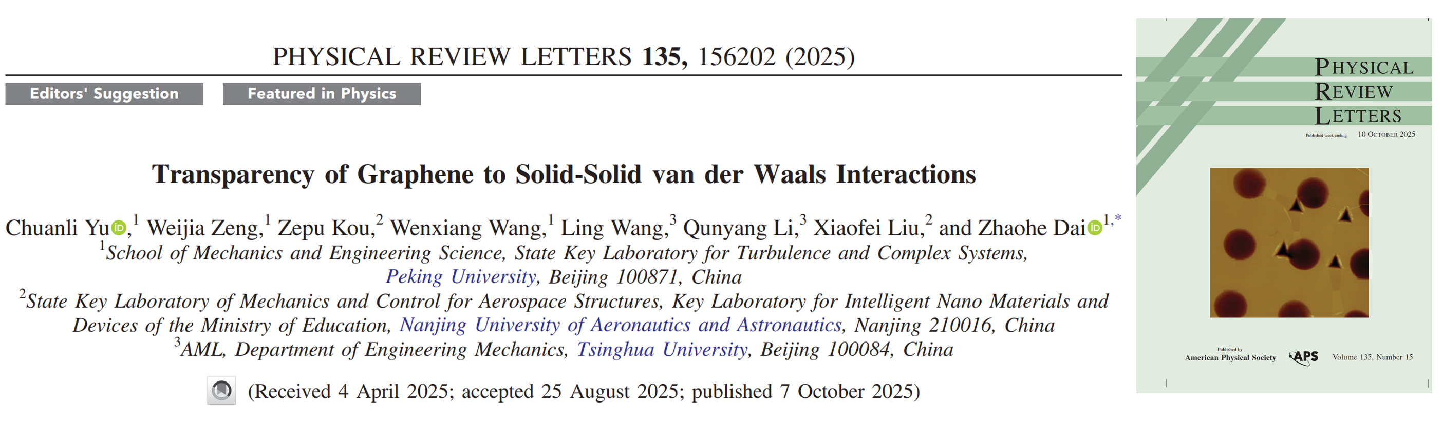 编辑:燕元 | 责编:安宁范德华作用是最基本的分子间作用力之一。虽然同质结构间的范德华作用在20世纪已得到了系统的理论研究和精细的实验表征,但对于异质结构(尤其是工程应用中常见的薄膜-基底体系),其作用是否可以通过分子间相互作用的简单体积积分来叠加,长期以来存在理论和实验上的争议。麻豆精品秘 国产传媒力学与工程科学学院力学系戴兆贺研究员及合作者近期围绕这一基础问题,以“Transparency of graphene to solid-solid van der Waals interactions”为题,于物理领域旗舰期刊Physical Review Letters发表论文。该工作被选为封面和编辑推荐论文,并被Physics Magazine报道。