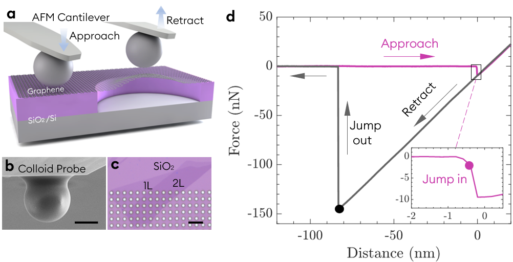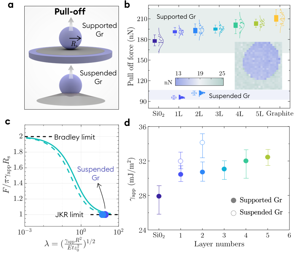 石墨烯-硅衬底体系中的薄膜厚度可以精确控制至原子尺度,为解决这一争议问题提供了理想实验平台。然而,在单原子层厚度下,薄膜极易发生几何非线性变形,对实验测量和数据解析带来巨大挑战。针对这一难题,团队提出了“原子力显微镜表征+非线性薄膜力学分析”相结合的研究方案。研究人员首先通过配备胶体探针的原子力显微镜(图1),测量了石墨烯在悬浮与支撑状态下的拉脱力(pull-off force)。结果表明,拉脱力可通过接触力学模型转化为界面能,其转换系数随薄膜可变形能力增强而渐近收敛至刚性结构的一半(图2)。这一修正对于解释薄膜材料自发撕裂等界面现象至关重要。