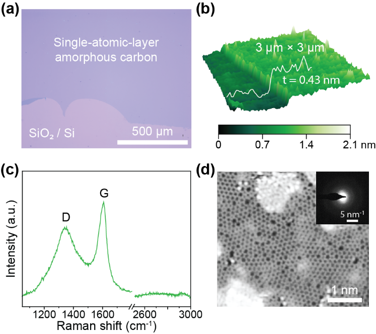 图1:单原子层二维无定形碳样品的微观表征