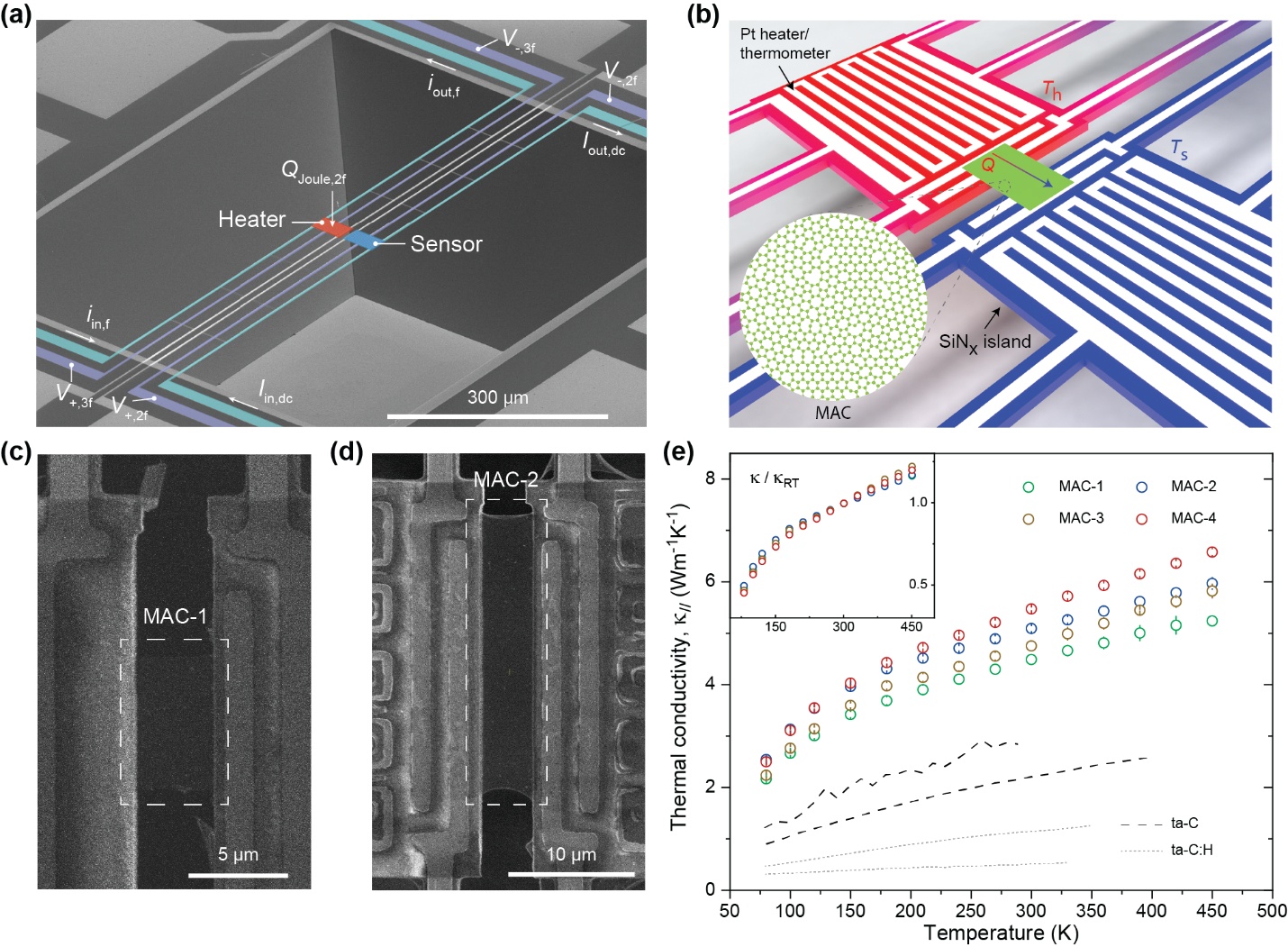 该工作以单原子层二维无定形碳为核心研究对象(图1)。在面外方向,团队首先构筑了厚度从单层至16层的系列叠层样品,进而利用频域热反射(FDTR)激光泵浦探测技术系统测量了样品热导(热阻),最终以单层样品为参考,获得叠层二维无定形碳面外方向最低可达0.08Wm-1K-1的等效热导率(图2),该数值已接近所有已知固体材料的最低热导率。在面内方向,团队首先基于MEMS技术自主设计制造了系列微热桥(microbridge)精密量热器件,进而转移并测量了四组悬空单原子层样品的面内热导率(图3)。该热导率随温度增加而逐渐增大的趋势,体现出典型的无定形材料特征。然而,十分有趣的是,虽然二维无定形碳具有接近100%的sp2成键比例,但其面内热导率数值总是显著高于传统的三维无定形碳,直接挑战了“无定形碳材料中sp2比例越高热导率越低”的传统认知。