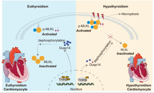 研究团队揭示双特异性磷酸酶14(Dusp14)通过去磷酸化MLKL抑制心肌细胞坏死性凋亡,在甲减导致的心力衰竭中发挥关键保护作用,为治疗甲减导致的心力衰竭提供了新方向。