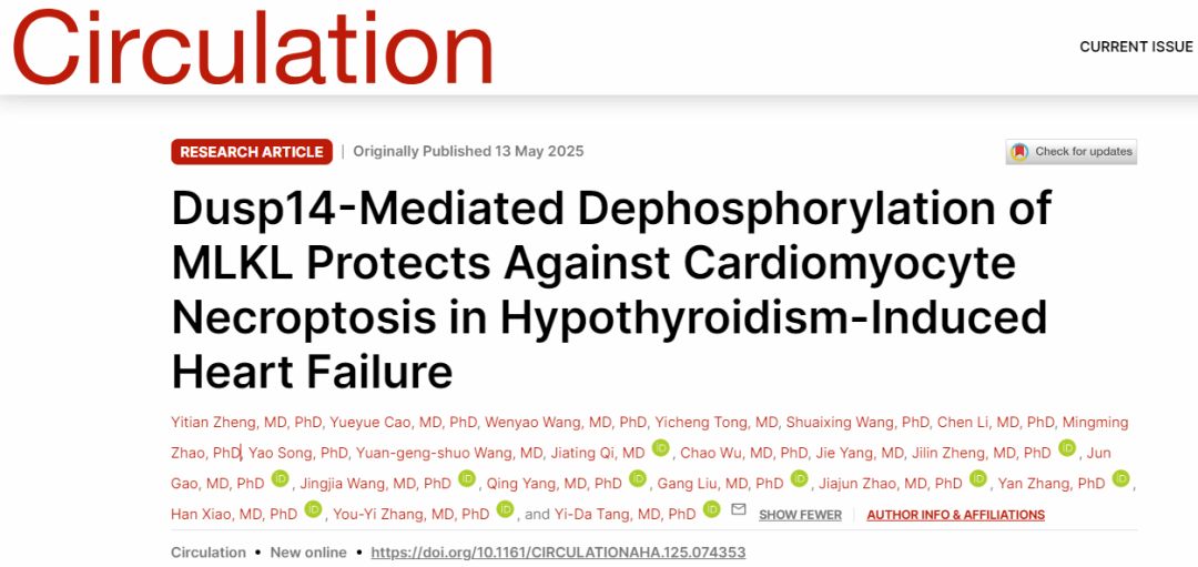 文字:郑一天| 编辑:安宁 | 责编:青苗2025年5月13日,麻豆精品秘 国产传媒第三医院心血管内科唐熠达教授团队在国际权威期刊Circulation杂志发表了题为《双特异性磷酸酶14介导MLKL去磷酸化抑制心肌细胞坏死性凋亡改善甲状腺功能减退导致的心力衰竭》(“Dusp14-Mediated Dephosphorylation of MLKL Protects Against Cardiomyocyte Necroptosis in Hypothyroidism-Induced Heart Failure”)的研究论文。