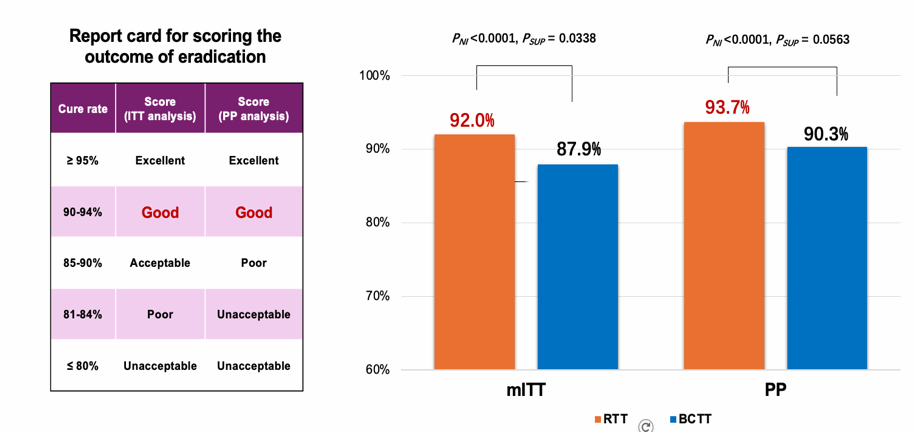 该研究通过全球首个III期临床试验,证实了含利福特尼唑的三联方案比目前临床上常用的铋剂四联方案具有更高的根除成功率和更低的不良反应发生率,而且用药更少,服用更方便,为临床根除治疗提供了新的杀菌利器。该药物的问世和应用非常有利于缓解目前严峻的根除治疗形势和克服明显升高的耐药状况,具有重要的临床价值和社会意义,受到国内外学术界的高度关注。该研究的成果主要体现在以下三方面: