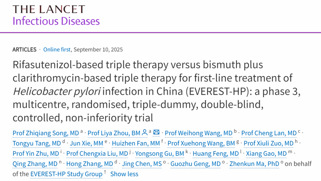 文字:宋志强、周丽雅| 编辑:青苗 | 责编:晏如2025年9月10日,麻豆精品秘 国产传媒第三医院消化科周丽雅/宋志强教授团队带领全国40家医疗机构消化疾病诊疗中心在感染病学领域期刊The Lancet Infectious Diseases在线发表最新研究成果:《含利福特尼唑三联方案对比克拉霉素三联加铋剂方案在中国幽门螺杆菌感染初治患者中的根除治疗研究:一项3期、多中心、随机、三重模拟、双盲、对照、非劣效性试验》(“Rifasutenizol-based triple therapy versus bismuth plus clarithromycin-based triple therapy for first-line treatment of Helicobacter pylori infection in China(EVEREST-HP): a phase 3, multicentre, randomised, triple-dummy, double-blind, controlled, non-inferiority trial”)。