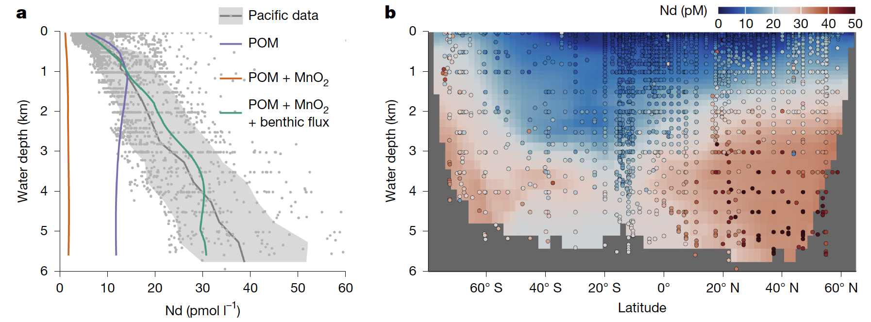杜江辉与合作者基于海水与沉积物观测,结合元素在水柱与沉积物中的循环模拟重新评估了不同来源颗粒对金属元素的吸附能力。研究团队在太平洋深海系统采集并分析了水柱-沉积物界面的海水、孔隙水和沉积物样品,并基于独立开发的SedTrace模拟系统,建立了金属元素的早期成岩模型,定量刻画了海底元素通量。团队进一步构建了三维海水元素循环模型,量化了水柱颗粒清扫与海底通量对海水中金属元素分布的影响。该研究通过观测与模型的深度融合,系统解析了金属元素从海洋表层到海底的完整循环过程。