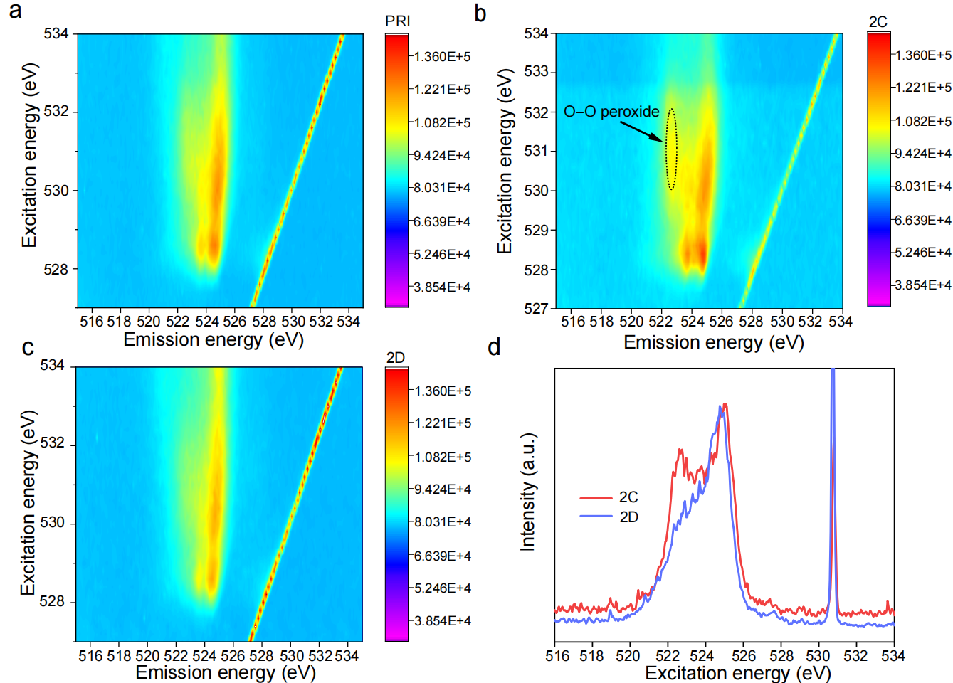 团队利用共振非弹性X射线散射谱(RIXS)深入探究O的氧化还原行为。无定形结构充电下,O的mRIXS图谱产生了新的指纹信号,(图3b、d)代表产生了类似过氧化物的“O-O”键合,这一信号在放电后可逆消失,(图3c)证明了无定形Li-V-O-F结构阴离子氧化还原的可逆性。