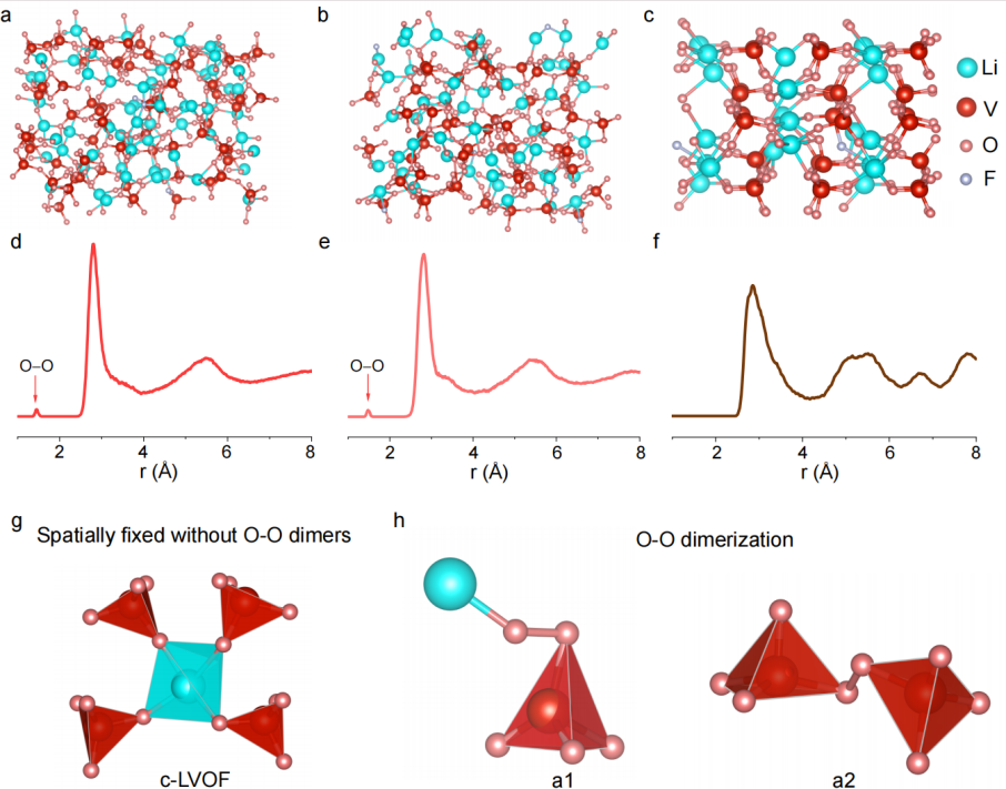 团队利用从头算分子动力学分别模拟了晶体结构与无定形结构下,Li-V-O-F正极在脱锂后的结构演化过程。在晶体结构中,O被固定在晶体框架中,即使施加1000K的高温促使其反应,结构仍未发生明显改变;(图4a、d、g)而同等条件下的无定形结构经历了多样的结构变化,离子混乱而无序地排布演变,促使活性O更易跨越热力学壁垒产生稳定的O-O二聚体。(图4b、c、e、f、h)这一计算与实验结果很好地吻合,展示了无定形结构在激活O-O二聚式反应时的本征结构与热力学驱动性。