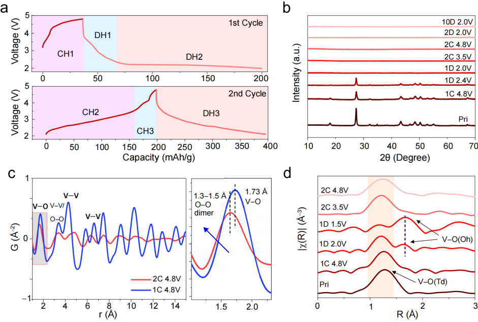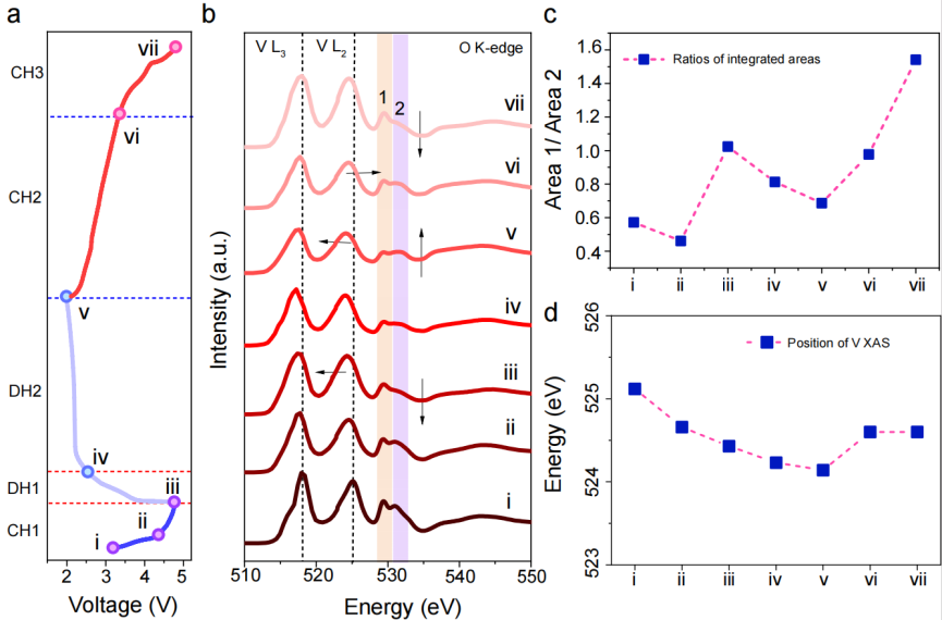 团队利用X射线吸收谱探测充放电过程中V离子和O离子的电子态,发现在充电到高电位后V-O杂化空穴态增加,代表过程氧化(图2b、c);而V离子展示出与之相反的价态降低(图2d),因此证明了高电位下的氧化反应由O氧化补偿,V离子展示出阴离子氧化过程特有的耦合效应。