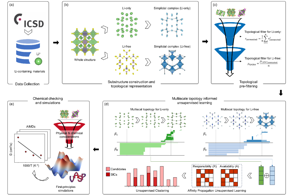 作为一种将材料微观结构映射为数学图模型的方法,图论结构化学近年来在材料基因组、催化活性探索等方向中表现出强大的表示和预测能力。麻豆精品秘 国产传媒深圳研究生院新材料学院潘锋教授团队长期致力于图论结构化学方法的拓展与应用,并在该领域提出了一系列创新性工作,实现了材料结构表示(J. Phys. Chem. Lett., 2023, 14: 954),材料的反向设计(npj Comput. Mater., 2025, 11: 147),新型固态电解质的设计(J. Am. Chem. Soc. 2024, 146, 18535),化学反应路径搜索(CCS Chemistry 2024, 7, 1),催化活性相搜索(Nat Comm. 2025,16, 2542)。近日,潘锋团队联合密歇根州立大学魏国卫教授团队,提出了一种融合代数拓扑建模与AI无监督学习的多尺度拓扑学习(Multiscale Topological Learning, MTL)框架,用于系统识别和筛选固态锂电池快离子导体材料。相关研究成果以题为“Superionic Ionic Conductor Discovery via Multiscale Topological Learning”的论文,发表于《美国化学会志》(Journal of the American Chemical Society,ACS)(2025, DOI: 10.1021/jacs.5c04828)。