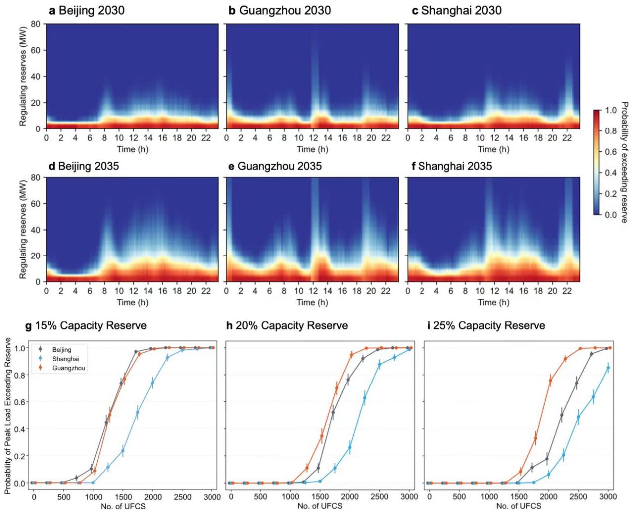 超快充的大规模部署显著增加了电网的运行风险,主要体现在调节储备(Regulating Reserve)和容量储备(Capacity Reserve)两个方面。研究表明,超快充引发的剧烈充电负荷爬升,尤其是在早晚分时电价切换时段,极有可能耗尽系统的调节储备,从而引发频率或电压失稳。此外,随着超快充站数量的增加,总充电负荷超过容量储备的概率也急剧上升。模拟结果显示,当部署1000座超快充站时,15%的容量储备裕度将变得不再充足;当部署规模接近2000座时,即使是25%的储备也面临严峻挑战(图2)。