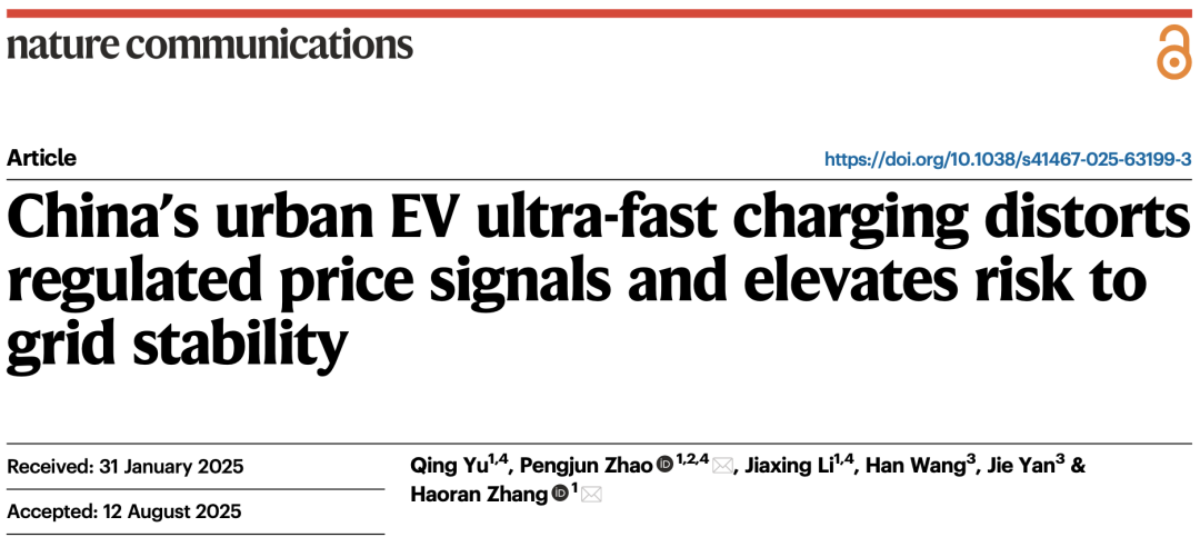 该研究成果以“China's urban EV ultra-fast charging distorts regulated price signals and elevates risk to grid stability”为题于2025年9月26日在线发表于Nature Communications期刊上。赵鹏军、张浩然为论文共同通讯作者,余庆博士后、赵鹏军、李家兴为论文共同第一作者。该研究受到国家自然科学基金(52472316)等资助。