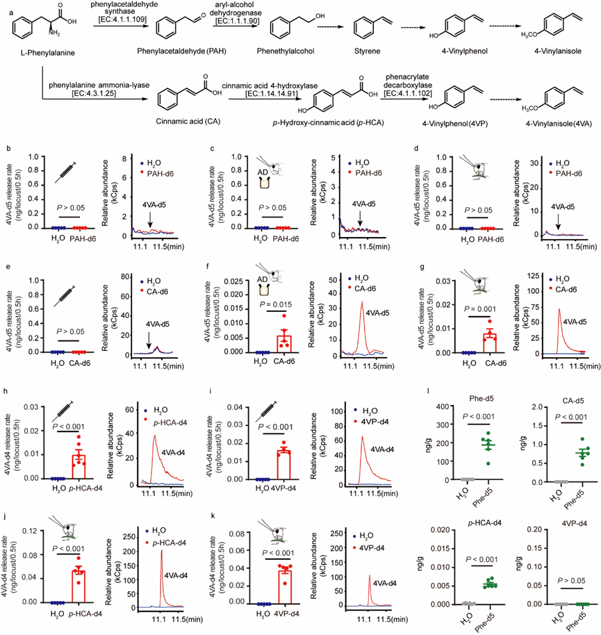 蝗虫群聚信息素是蝗虫群聚进而形成蝗灾的重要因素之一。康乐研究团队长期开展蝗虫信息素研究,于2020年首次报道了4-乙烯基苯甲醚(4VA)是飞蝗的聚集信息素(Nature 2020)。然而,到目前为止,4VA的生物合成通路与密度依赖的释放机制仍然未知。雷晓光团队长期开展天然产物生物合成研究与生物催化研究,近期在相关领域中做出了多项开拓性研究成果(Nature Chemistry 2020; Nature Catalysis 2021; Science 2024; Accounts of Chemical Research 2024)。为了确定4VA的合成通路,康乐团队与雷晓光团队合作,确定了4VA的合成底物是来源于植物的苯丙氨酸,并预测了两条4VA的合成通路。通过饲喂或注射稳定同位素标记的候选中间体,最终确定了飞蝗中4VA合成通路是:苯丙氨酸(Phe)-肉桂酸(CA)-对羟基肉桂酸( p-HCA)-4-乙烯基苯酚(4VP)最后到4VA。Phe-CA-p-HCA的转化在肠道中完成, p-HCA出肠道随血淋巴扩散并转化为4VP,最终合成4VA释放到体外。此外,蝗虫可以直接从植物中快速获取Phe、CA和 p-HCA(木质素合成关键化合物),只需重点完成最后4VP和4VA的转化即可(图1)。
