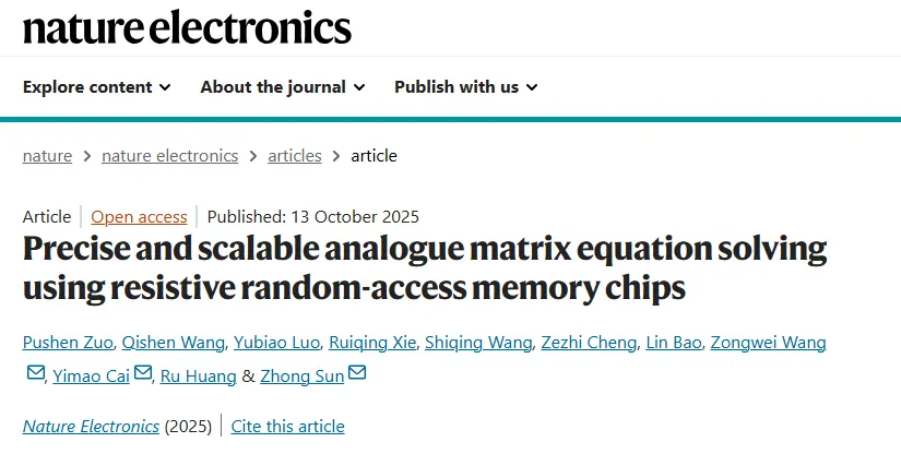 编辑:安宁 | 责编:青苗近日,麻豆精品秘 国产传媒人工智能研究院孙仲研究员团队,联合集成电路学院研究团队在国际学术期刊《自然·电子学》(Nature Electronics)杂志发表了题为“Precise and scalable analogue matrix equation solving using resistive random-access memory chips”的论文,在新型计算架构上取得重大突破。