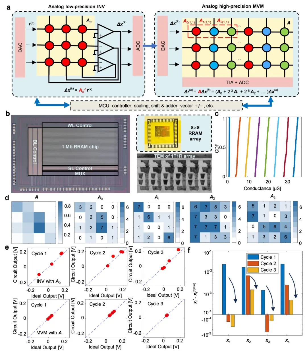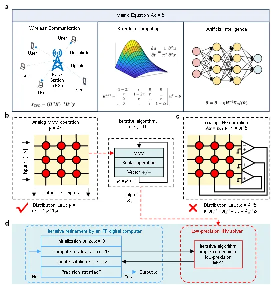研究团队基于迭代算法,结合了模拟低精度矩阵求逆和模拟高精度矩阵-向量乘法运算,开发了一种基于全模拟矩阵运算的高精度矩阵方程求解方案(图2)。其中,模拟低精度矩阵求逆和模拟高精度矩阵-向量乘法运算保持了模拟矩阵计算固有的低复杂度。特别需要注意的是,模拟矩阵求逆有助于减少迭代次数,因为该方法可以在每次迭代中提供近似正确的结果。而高精度模拟MVM通过位切片方法,实现迭代细化过程。