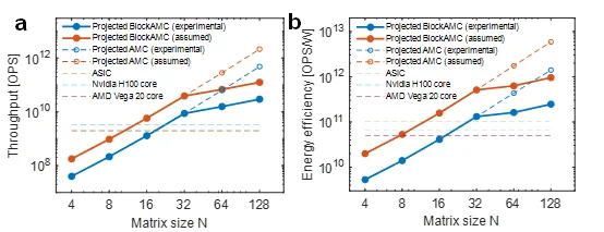 在计算性能方面,该技术表现出卓越的加速能力与能效。测试结果表明,在求解32×32矩阵求逆问题时,其算力已超越高端GPU的单核性能;当问题规模扩大至128×128时,计算吞吐量更达到顶级数字处理器的1000倍以上。同时,该方案在能效方面亦表现突出,在相同精度下能效比传统数字处理器提升超100倍,为高能效计算中心提供了关键技术支撑。