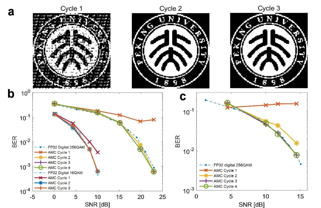 在应用验证层面,该方法被成功应用于大规模多输入多输出(MIMO)系统的信号检测任务。研究团队展示了基于迫零检测的图像恢复效果,在第二个迭代周期内,接收图像即与原始图像达到高度一致。进一步的误码率-信噪比分析显示,仅需3次迭代,该系统在无线通信场景下的检测性能即可媲美32位浮点精度数字处理器(图4),凸显出其在实时信号处理中的潜力。