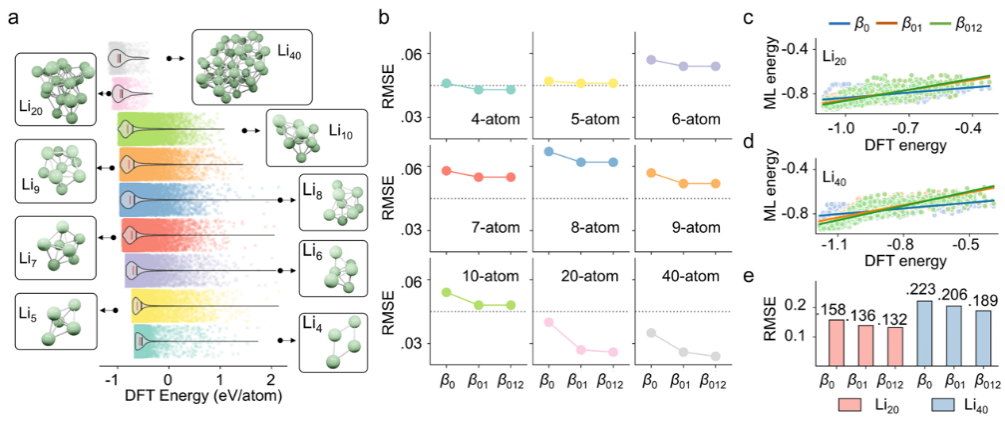 研究团队利用一个包含136,287个锂原子簇(涵盖4原子到40原子等多种体系)的大型数据。研究的主要结论是,引入更高维度的拓扑信息能持续提升能量预测的精度。具体而言,在预测任务中,随着1维(β1)和2维(β2)拓扑特征的加入,模型的平均绝对误差(MAE)显著降低。对于所有原子体系,包含0、1、2维信息的特征集(β012)均比只含0维信息(β0)或0、1维信息(β01)的特征集表现更优。