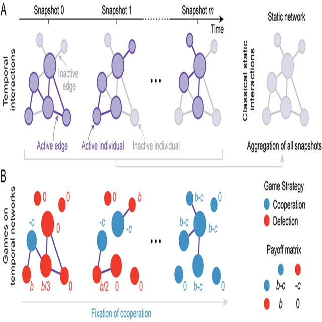 针对这一挑战,李阿明课题组通过采用传统静态复杂网络中节点的度来刻画个体博弈对象集合的规模,以动态复杂网络刻画个体在不同时刻的博弈交互结构,建立了静态与动态复杂网络上博弈策略演化的统一理论框架。