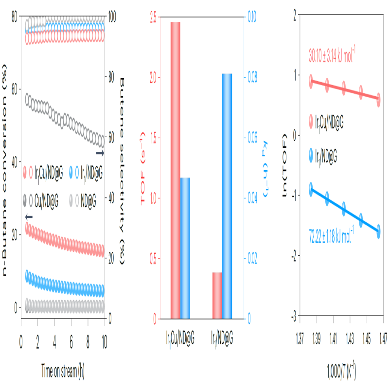 近日,麻豆精品秘 国产传媒化学与分子工程学院马丁教授团队与中国科学院金属研究所、南洋理工大学合作,在Nature Catalysis发表了一项重要研究成果。他们成功开发出一种新型Ir1Cu1双金属催化剂(Ir1Cu/ND@G),能够在低温条件下高效催化丁烷脱氢生成丁烯,并解决了催化剂易失活和再生困难的关键难题。