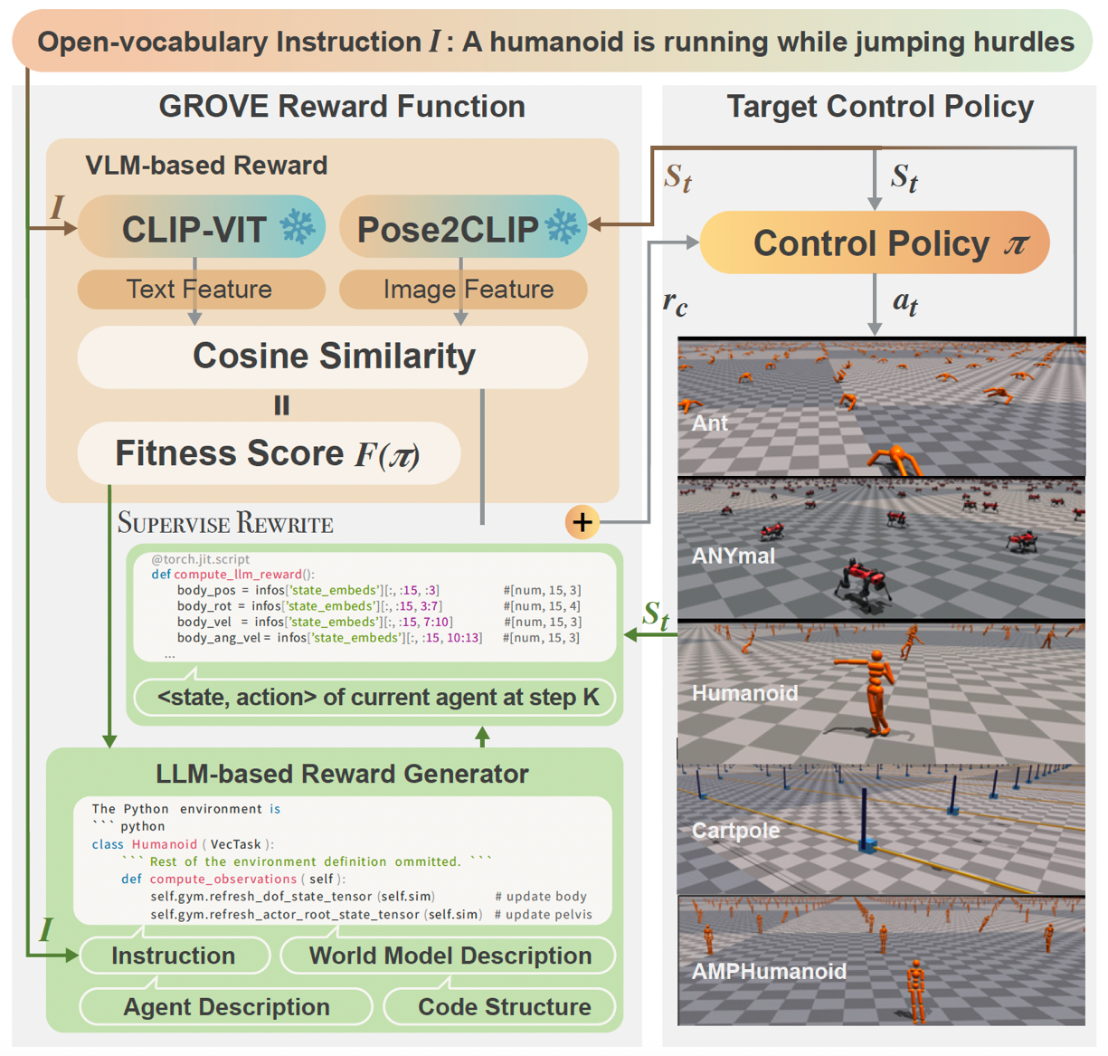 麻豆精品秘 国产传媒人工智能研究院朱毅鑫课题组及合作者的成果以“GROVE: A Generalized Reward for Learning Open-Vocabulary Physical Skill”为题,被人工智能顶级会议CVPR 2025接收为Oral Presentation。