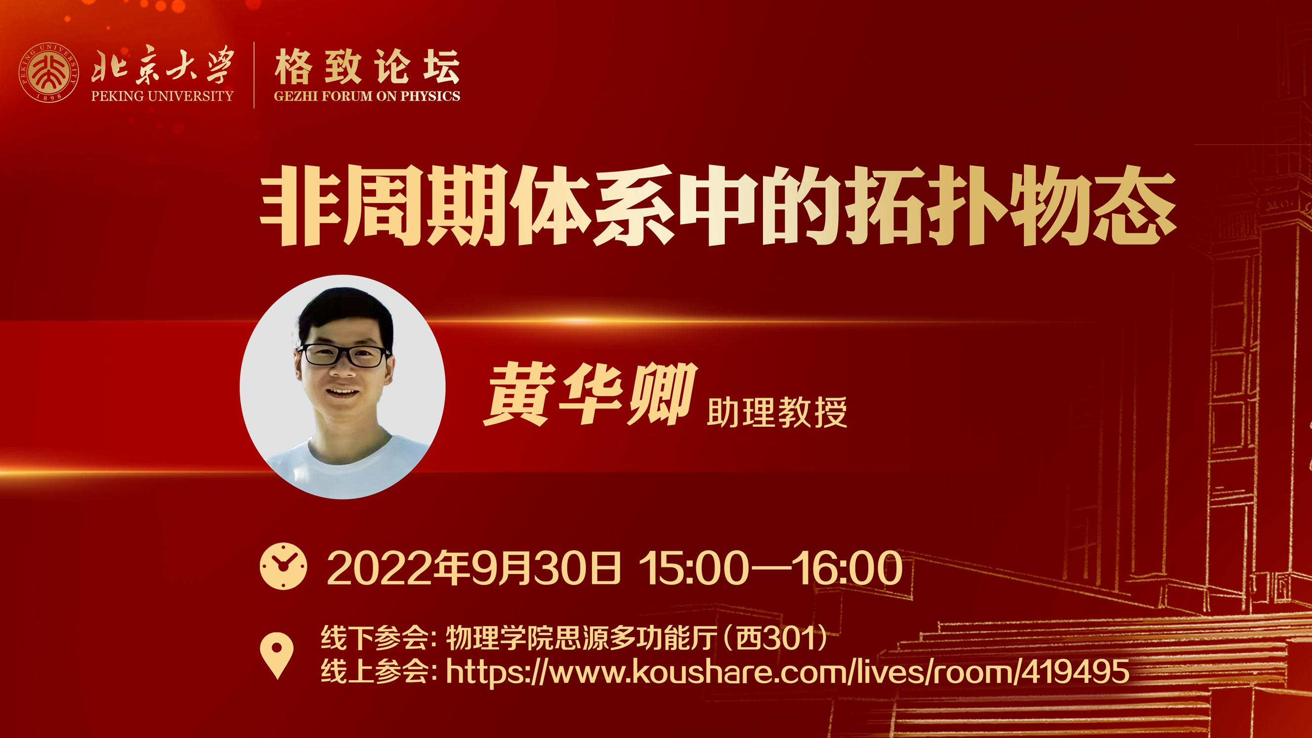 报告题目:非周期体系中的拓扑物态 报告人:黄华卿(助理教授) 主持人:李定平教授 报告时间:2022年9月30日(星期五)5:00—16:00 线下参会:物理学院思源多功能厅(西301) 线上参会:...