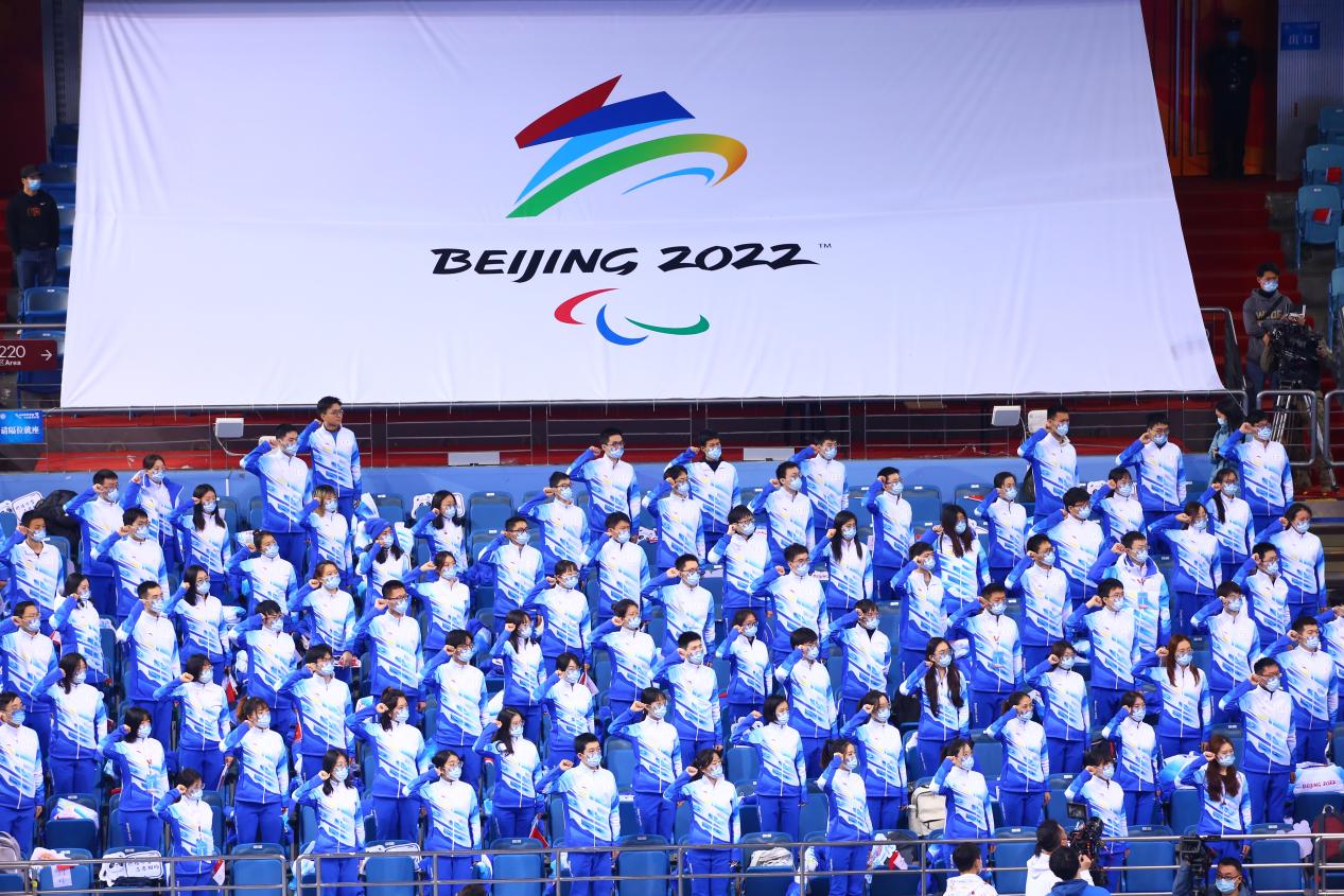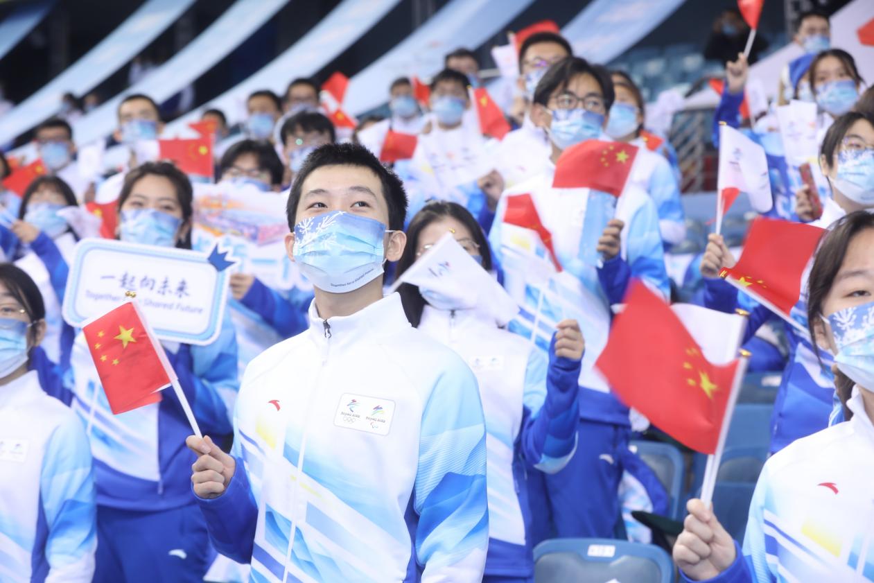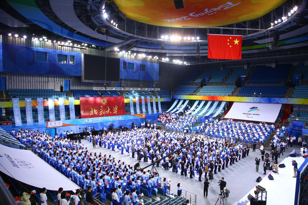 北京2022年冬奥会会旗在场内志愿者手中传递