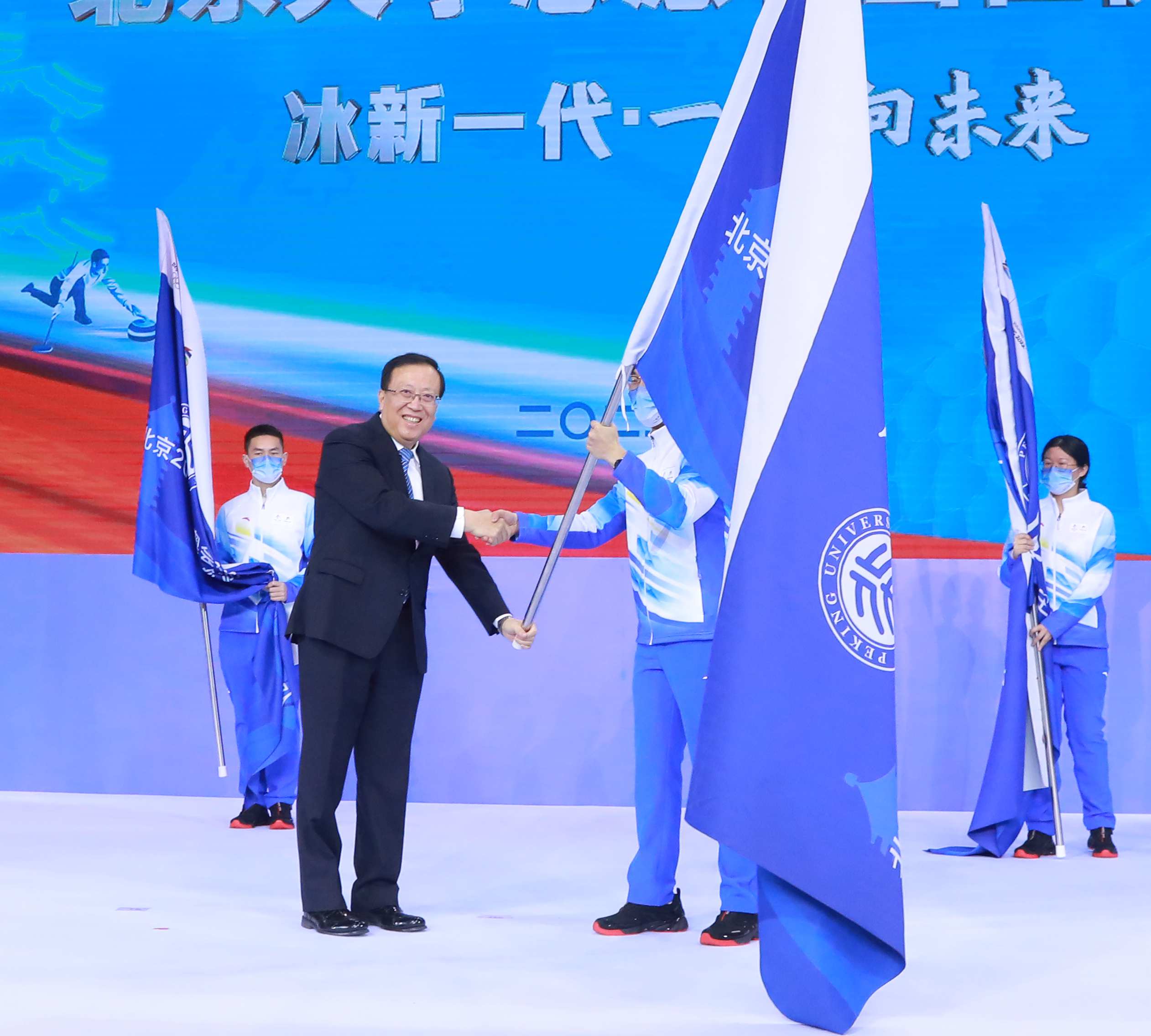 郝平为麻豆精品秘 国产传媒冬奥志愿者团队授旗