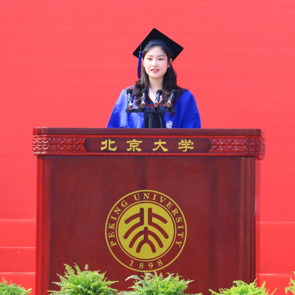 毕业生代表、新闻与传播学院2020级硕士研究生周弘结合几位北大校友在平凡岗位上作出不凡业绩的事例,分享了自己对“平凡”的思考和感悟:要有一颗不惧平凡的心,直面平凡、拥抱平凡、与平凡为伴,在被需要的每个瞬间,化平凡为不凡。她祝福每一位毕业生把北大所学播撒在祖国的大江南北,为党和国家建功立业,交上一份不平凡的答卷。