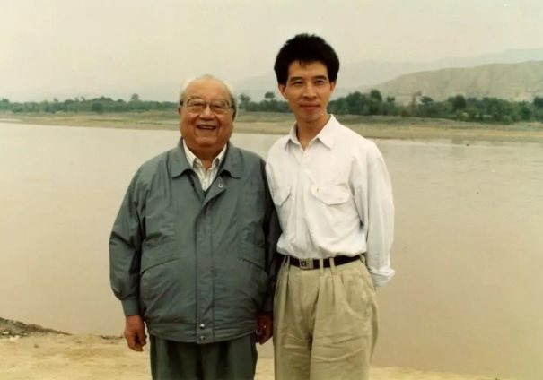1992年秋,邱泽奇与费孝通在调研途中(甘肃省景泰县黄河边)